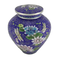 Lily Dragonfly Blue Cloisonne Cremation Urn Blue and indigo flower design. Dimensions: 8.8 x 7.7..